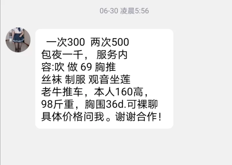 九月底国庆之前,外地朋友来旅游,晚上一起吃饭喝酒。送走朋友之后回家,百无聊赖,就打开手机看看附近的人。找到一姑娘聊了聊,本来喝完酒之后就容易产生欲望,遂感精虫上脑,于是出门酒店开一房间约好上门。 到酒店开好房之后等了好久,估计有一个小时,睡了一觉酒都早就醒了,妹子才姗姗来迟,不过开门看了看,长相不错,身材不错,丰满型。进屋先洗洗,我之前自己洗完了,不想再湿一次,就只有妹子自己洗,之后上床开始服务。妹子脱光后,发现胸果然不错,又大又挺又软。从上亲到下,胸推,口活,69等等。口活69了得有十几分钟,戴套开干,先女上男下,变换各种姿势,大概四十分钟之后一射千里。 妹子长相身材都不错,比较嫩,不算苗条,属于丰满型的,但是也并不胖。非常的温柔,说话都是柔声细语的,搂在怀里边摸边聊天很愉快。 应该是有鸡头的,不过上面联系方式(手机号/QQ/微信)里的电话和微信是妹子自己私人的。