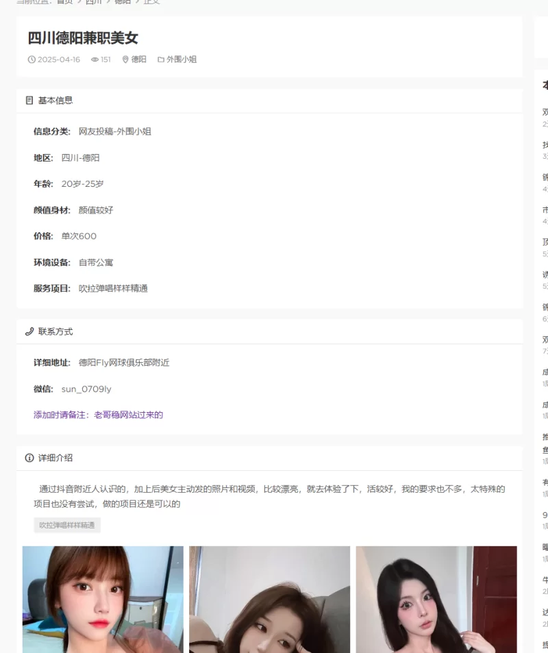 威客管理提示:要求付定金 保证金的,总之提前要钱的都是骗子 成都出差,晚上精虫上脑,微信找到的。看微信照片张的还行,平时做微商,晚上兼职。关键会聊天,聊了一会儿,了解了下价格,决定就找她了。上门后一看,本人与照片相差不大,皮肤白,身材好,大长腿,喜欢丝袜的狼友有福了。刚开始放不开,让陪洗澡都扭扭捏捏的,上床后聊一会儿,主动上手挑逗,一会儿我受不了提枪上马,感觉逼紧水多,问了一句,说是半个多月没做了,卧槽。干了一会儿,妹子说干脆不戴套了,我考虑了一会儿还是放弃了,怕呀。交换了几个姿势,最后女上的时候忍不住射了。推荐女上位,感觉特爽。休息一会儿又来了第二次,早上走之前又干了一炮,一千块,值得尝试。